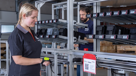 - Das iDISPLAY mit Pick-by-Light‑Funktion und Scanvorgänge am Kanban-Regal und Arbeitsplatz sorgen für eine schnelle, fehlerarme Kommissionierung und Auslieferung.